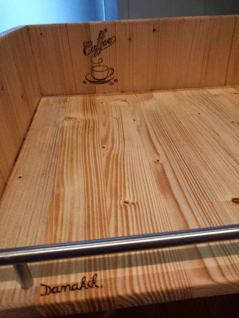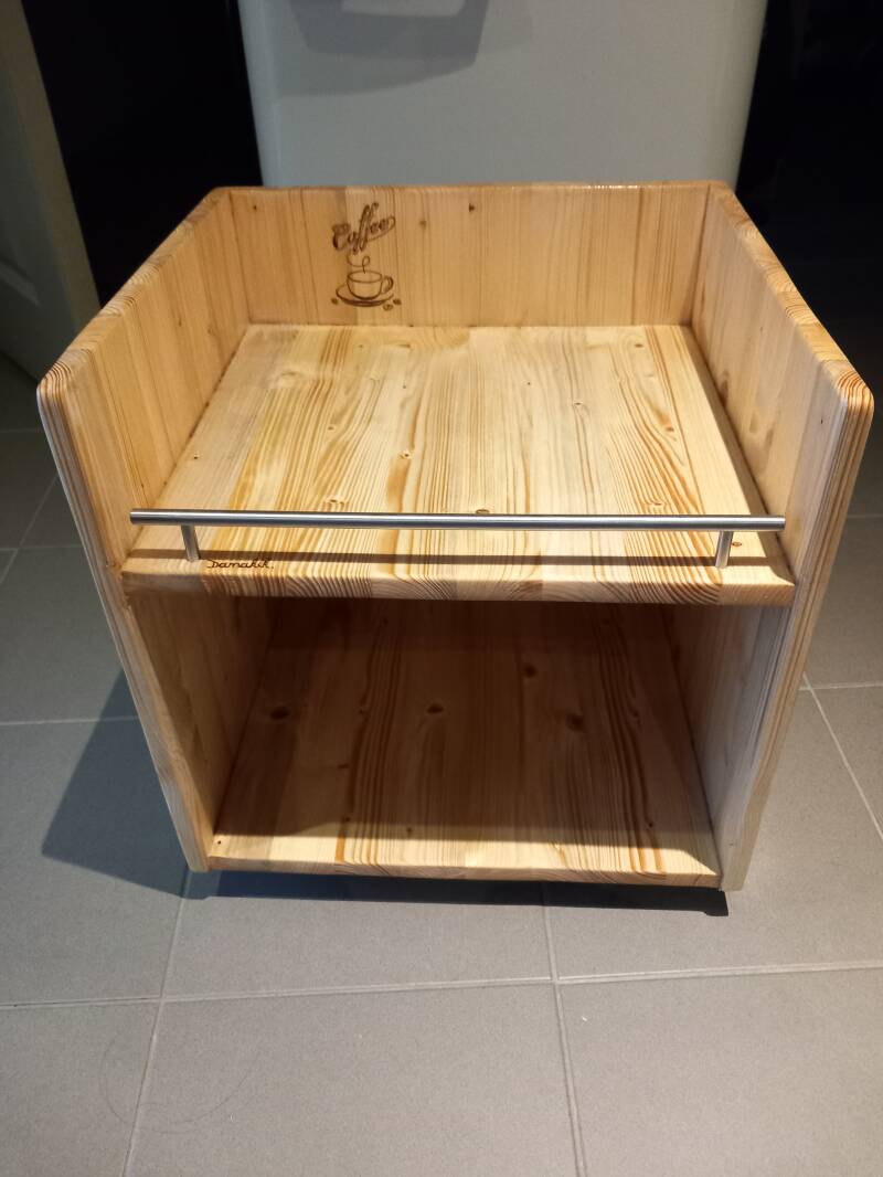 Op maat gemaakt kastje voor koffiemachine, verrolbaar met ruimte voor tassen en toebehoren: