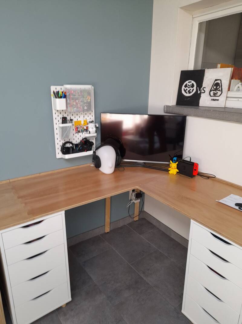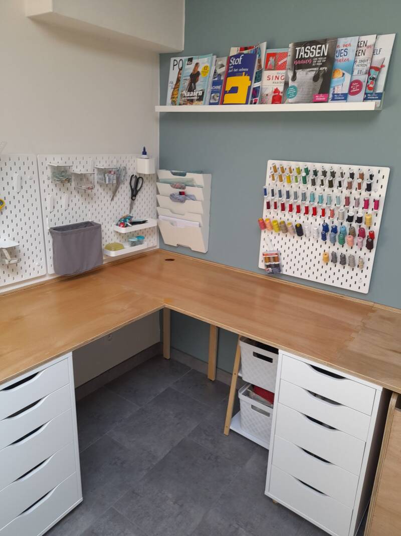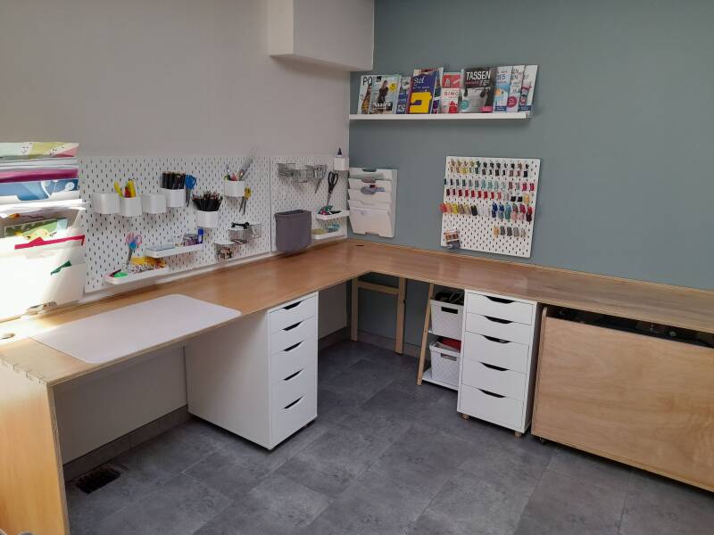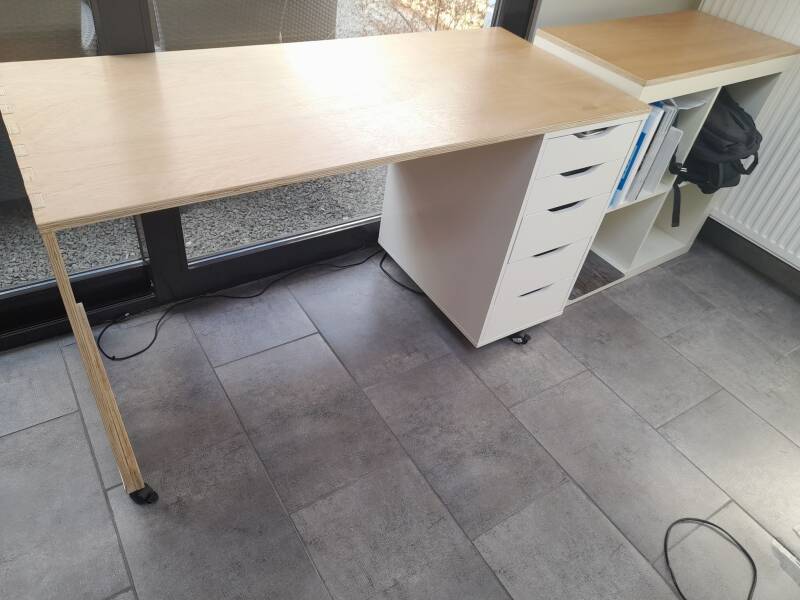 Op maat gemaakt bureau + mobiele werkplaats en opbergkist op wieltjes.